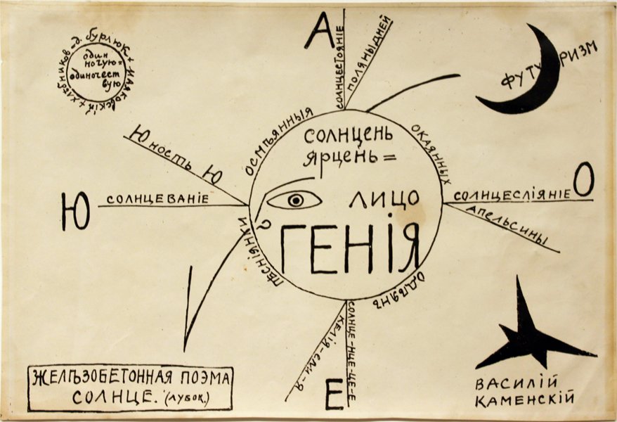 Kamenskiy's 1918 visual poem directed unto the sun. Incorporates schematic futurist stylings: a set of idea-associations and sometimes semi-made up or "combine" words revolving around the sun and semantically, implicityly, or viscerally, emphaticaly connected to its "idea essence" as the ultimate creative "genius", the term which labels the sun itself.